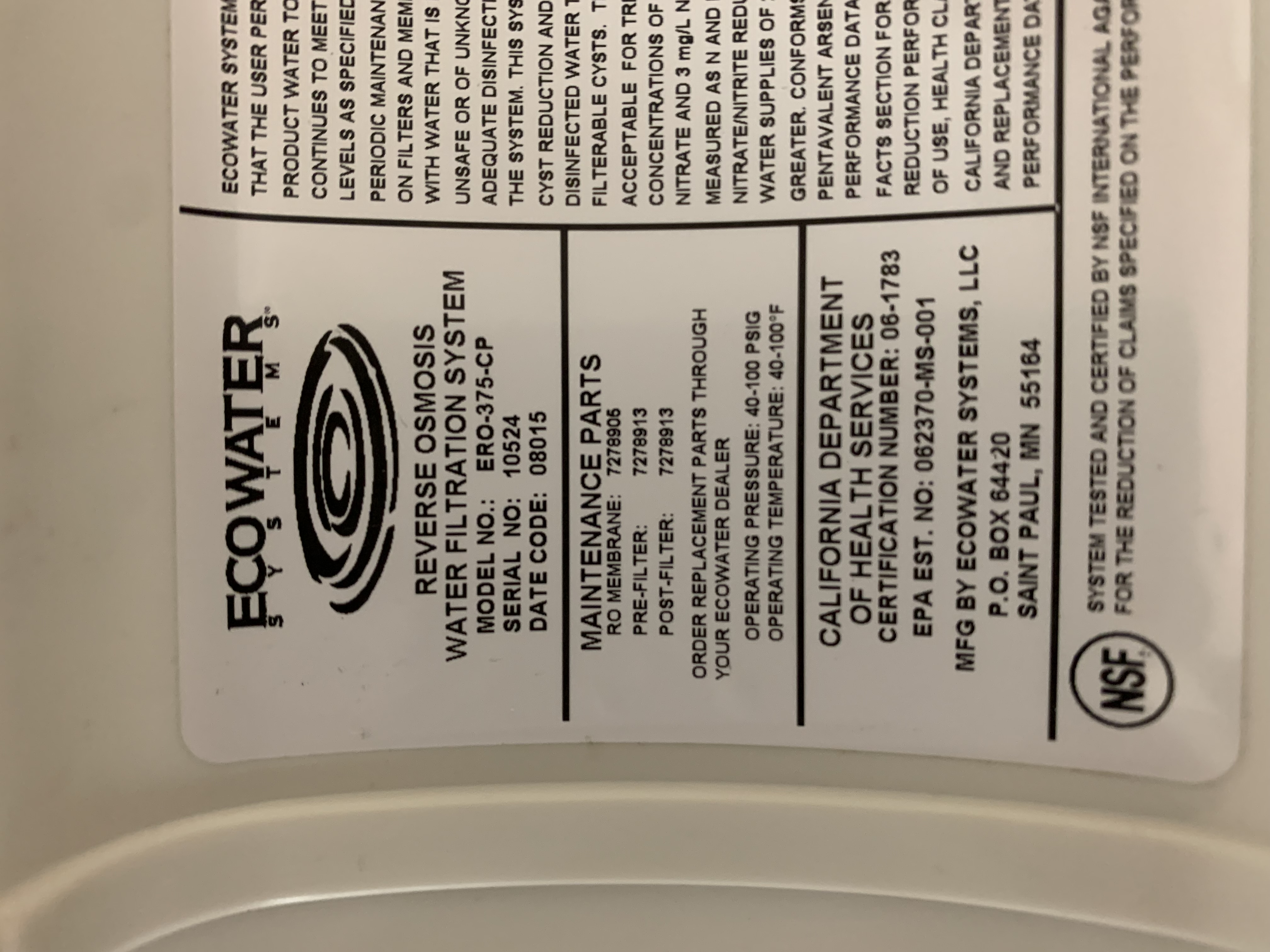 ECOWATER REVERSE OSMOSIS WATER FILTRATION SYSTEM RO MEMBRANE, PRE-FILTER, POST FILTER, PRESSURE TANK MODEL NO. ERO-375-CP GOOD CONDITION!